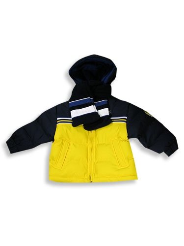 Private Label - Toddler Boys Hooded Winter Jacket, Navy, Yellow, Zip Front, Slit Pockets, Elastic at Wrists, Matching Fleece Scarf, Shell 100% Polyurethane with Polyester Backing, Lining and Scarf 100% Polyester, #8620
